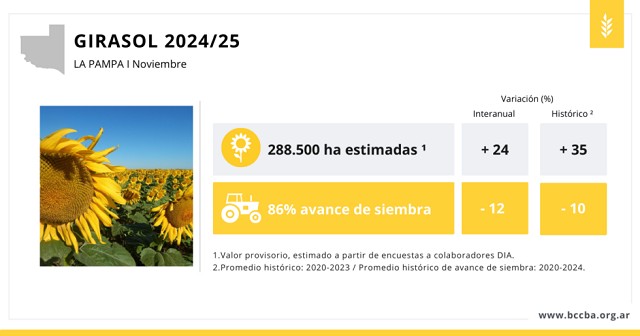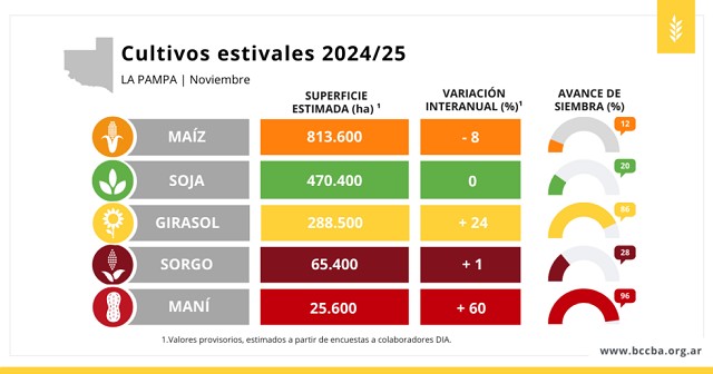 A partir de la información proporcionada por referentes locales a mediados de noviembre, se actualizó la estimación de superficie para la campaña estival 2024/25. En comparación con las proyecciones de septiembre, y con la siembra ya avanzada, destacan los incrementos interanuales en la superficie de girasol (+24%) y maní (60%).