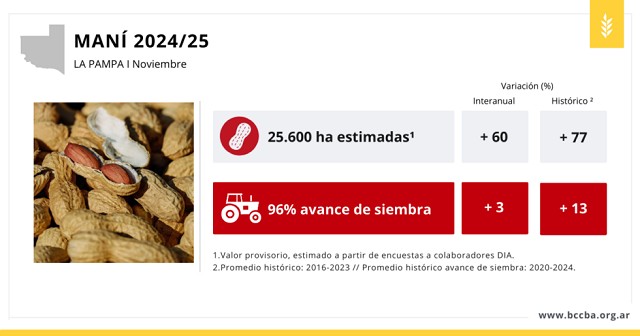 Según indicaron referentes locales, las condiciones climáticas y de suelo para la siembra de maní fueron óptimas. Hacia mediados de noviembre, la labor se encontraba casi concluida, y la totalidad de la superficie cultivada estaba en etapa de emergencia vegetativa.