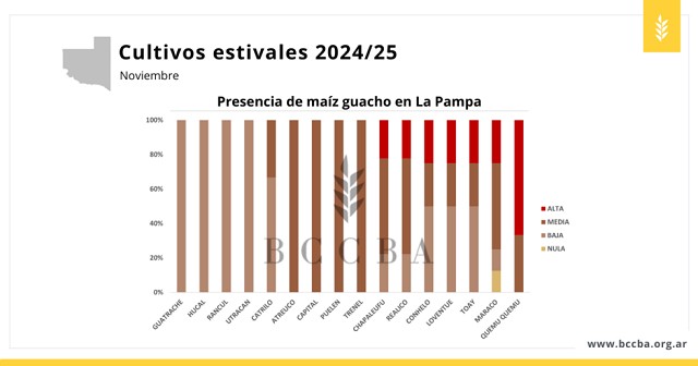 De acuerdo con los reportes de colaboradores DIA, las lluvias de octubre y noviembre favorecieron la germinación de maíces guachos, cuya presencia se observa de manera generalizada en todos los departamentos relevados y sobre todo en las cabeceras de los lotes. Las localidades más afectadas, con altos niveles de presencia, son Villa Mirasol, Quemú Quemú, General Pico, Mauricio Mayer, Alta Italia e Ingeniero Luiggi.