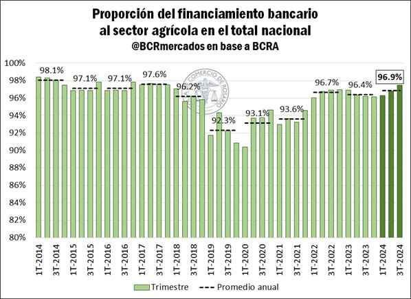 Se destaca que, a pesar de la gran cantidad de divisas y dinero que genera el sector agrícola, es relativamente bajo el nivel de financiamiento que obtiene por parte de entidades financieras nacionales. Esto se debe a que este sector, a lo largo de los años, encontró otras alternativas para la financiación de los insumos y el capital de trabajo, como el mercado de capitales y el crédito comercial, que se analizaron con mayor detalle en esta nota.