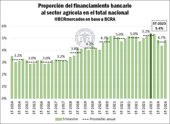 En cuanto a la proporción del financiamiento bancario al sector agrícola en relación con el total de préstamos bancarios, se observa que ésta fluctuó entre el 2,9% y el 5,4% durante la última década, aunque con un notable incremento en el último lustro. De hecho, en el año 2023, la participación promedio del sector agrícola en el total de créditos alcanzó un máximo histórico de 5,2%, registrando al tercer trimestre de ese año una cifra récord del 5,4%. Este porcentaje guarda sentido si se tiene en cuenta la magra cosecha del ciclo 2022/23, luego de tres años consecutivos de sequía, que llevó al sector agrícola a depender de un mayor financiamiento para hacer frente a la campaña siguiente. No obstante, la participación cayó al 4,7% en el promedio de los primeros tres trimestres del año actual, retornando a los valores de 2020.