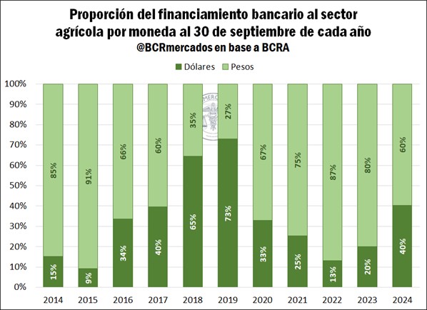 De esta manera, la participación del financiamiento bancario en dólares muestra este año un crecimiento tanto en términos absolutos como relativos. Mientras que en el período comprendido entre el año 2014 y 2023 el financiamiento en dólares mostró una participación promedio del 33% sobre el total, en 2024 dicha participación se ubicó 7 p.p. más arriba. Cabe destacar, sin embargo, que en 2019 los préstamos en dólares al sector agrícola alcanzaron una proporción máxima desde finales de la convertibilidad, tal como se analizó oportunamente en esta nota. Entre enero y septiembre de aquel año, el porcentaje de créditos en moneda extranjera llegó a alcanzar el 73% del total, descendiendo bruscamente en los años posteriores de la mano de la reintroducción y el posterior endurecimiento de las restricciones al acceso al Mercado Libre de Cambios.