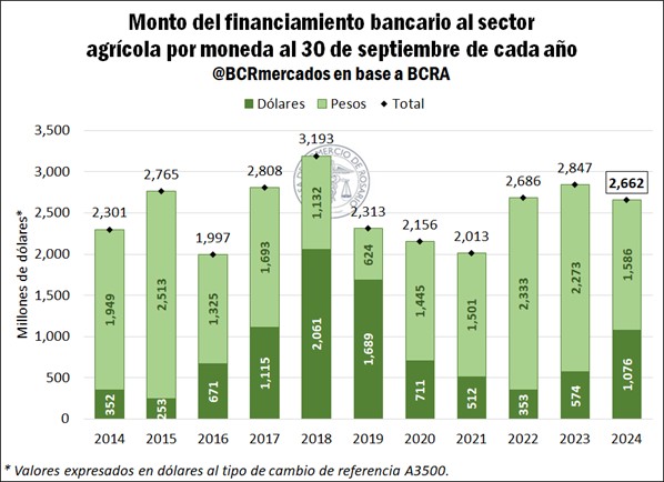 Según datos del Banco Central de la República Argentina (BCRA), al 30 de septiembre del año en curso, convirtiendo los préstamos en pesos a su equivalente en dólares al tipo de cambio A 3500, el stock acumulado de préstamos otorgados por entidades financieras al sector agrícola (cultivos de cereales, oleaginosas y forrajeras) alcanzó un total de U$S 2.662 millones. Este financiamiento comprende diversos instrumentos: adelantos en cuenta (corriente u otras a la vista) o de la compra de documentos, los instrumentados bajo la modalidad de documentos a sola firma, los documentos descontados, los préstamos hipotecarios, prendarios, personales y a titulares del sistema de tarjetas de crédito, y cualquier otro préstamo de efectivo. De esta suma, U$S 1.586 millones corresponden a préstamos otorgados en pesos, convertidos a dólares al tipo de cambio A 3500, mientras que los restantes U$S 1.076 millones fueron otorgados en moneda extranjera.