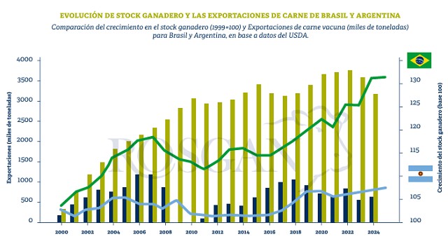 Basta con observar el crecimiento que experimentó la ganadería de Brasil en los últimos 25 años. Partiendo de niveles de exportaciones similares a los entonces registrados por Argentina, hoy es el primer proveedor mundial de carne vacuna, habiendo multiplicado por 7 su volumen de exportaciones. Esto se logró sobre la base de un crecimiento y mejoramiento sostenido de su stock ganadero, que le permitió atender su mercado interno mientras apostaba fuertemente al desarrollo de la exportación.