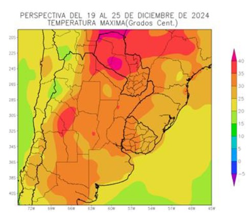 Coincidentemente con el Solsticio de verano del hemisferio sur, que tendrá lugar en horas de la mañana del 21 de diciembre, los vientos del Trópico se extenderán con vigor, produciendo temperaturas máximas sobre lo normal en la mayor parte del área agrícola, salvo su extremo occidental y el Litoral Atlántico, que recibirá vientos marinos. Paralelamente se producirá el avance de un frente de tormenta con actividad muy desigual, que dejará a gran parte del área agrícola con aportes escasos, concentrando su actividad sobre el oeste y el norte de su extensión, con un foco secundario sobre el Sudeste del Uruguay. Junto con el frente arribará una masa de aire polar, produciendo temperaturas mínimas bajo lo normal en la mayor parte del área agrícola, a excepción de su extremo centro-norte, con riesgo de heladas localizadas sobre la Serranías Bonaerenses. Al final de la perspectiva, los vientos del norte volverán a incrementar la temperatura, pero hacia su final, retornarán los vientos del sur, volviendo a reducir los registros.