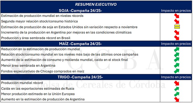 En Estados Unidos, la cosecha de la oleaginosa ha llegado a su fin, y la producción estimada por parte del USDA no ha sufrido modificación alguna respecto al valor de noviembre, manteniéndose en 121 millones de toneladas. Por otra parte, la producción de aceite de soja aumentaría respecto al mes pasado debido a una mayor tasa de extracción, lo cual podría sostener la demanda de poroto y de esta manera brindar un soporte al precio en Chicago.