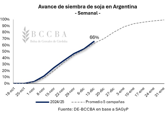 Según estimaciones de la Secretaría de Agricultura, Ganadería y Pesca de la Nación (SAGyP) el 66% de las 17,9 millones de hectáreas proyectadas, ya se encuentran sembradas. Este valor se encuentra en línea con el avance de la campaña pasada y tres puntos porcentuales por sobre el promedio de las últimas cinco campañas. La siembra de soja de primera se encuentra, en general, casi finalizada restando solamente lotes con soja de segunda a la espera de terminar con la cosecha de cultivos invernales. Por su parte, la Bolsa de Comercio de Rosario (BCR) proyecta una producción de entre 53 y 53,5 millones de toneladas, mayor a lo estimado en noviembre dado las condiciones climáticas favorables que se presentan hasta el momento.