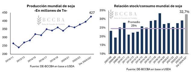 La producción mundial de soja estimada por el Departamento de Agricultura de Estados Unidos (USDA) se situaría en 427 millones de toneladas, cifra mayor a la estimada en el mes de noviembre, a causa de mayor producción en Argentina, Brasil, Bolivia.