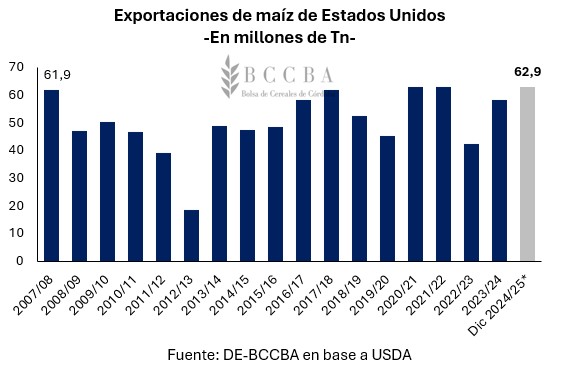 La cosecha del cereal también finalizó en Estados Unidos, con condiciones excepcionales, dando como resultado una producción de 384,6 millones de toneladas, el segundo mejor resultado de las últimas ocho campañas. Además, en el presente ciclo se produciría un récord de exportaciones del país norteamericano, con casi 63 millones de toneladas.