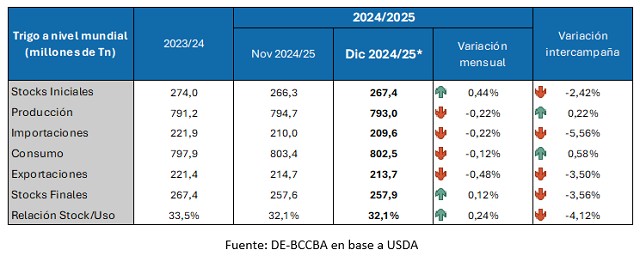 El consumo interno aumentaría a 403,6 millones de toneladas, convirtiéndolo en un máximo histórico, mientras que la molienda también crecería. En cuanto al comercio internacional, tantos las importaciones como las exportaciones serían mayores a las proyectadas en noviembre, ubicándose en 178 y 182 millones de toneladas respectivamente. En cuanto al stock final, este aumentaría levemente respecto a la estimación del mes pasado y la relación stock consumo se mantendría en el 32,7%, el segundo volumen más elevado de la historia.