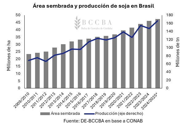 En Brasil, según estimaciones de la Compañía Nacional de Abastecimiento (CONAB), la siembra de soja se posiciona en un 90% del área, estimada en 47,4 millones de hectáreas, durante la primera semana de diciembre. Este avance, se produjo como consecuencia de la regularización de lluvias en las principales zonas productoras del país. La CONAB prevé una producción récord de 166,2 millones de toneladas, como consecuencia de un rendimiento de 35,1 qq/ha y una mayor área sembrada, la cual sería récord.