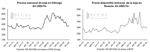 Al momento, el mercado de la soja se caracteriza por buenas producciones estimadas, y elevados niveles de stock, lo cual impacta negativamente en el precio. En lo que va de diciembre, el precio promedio de la soja en Chicago se posiciona en USD 364 por tonelada, el segundo valor más bajo del año. En el mercado local, se observa un comportamiento similar, donde el precio promedio disponible en Rosario alcanzó los USD 290 por tonelada, el valor más bajo desde abril del corriente año.