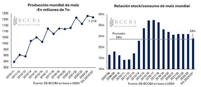 Según la estimación de diciembre del USDA, la producción mundial de maíz para la campaña 2024/25 se posicionaría en casi 1.218 millones de toneladas, 1,5 millones de toneladas menos que lo proyectado en el informe de noviembre. Lo anterior se produce como consecuencia de caídas en la producción de Unión Europea, México e Indonesia. Asimismo, la producción mundial seguiría ubicándose como la segunda más alta en las estadísticas.