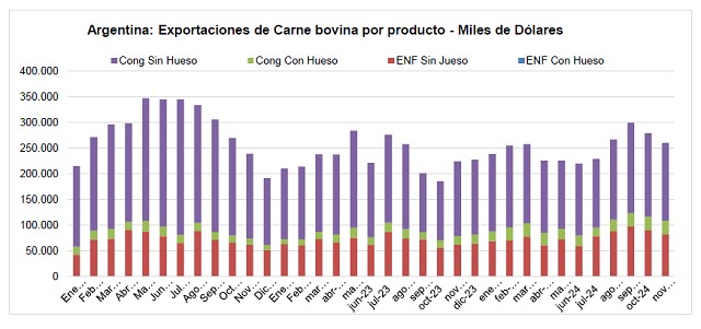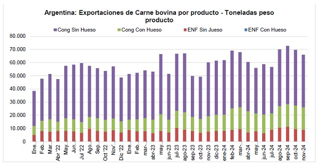 Las exportaciones del mes de noviembre de 2024 alcanzaron un volumen cercano a las 66,0 mil toneladas peso producto de carne bovina refrigerada y congelada; por un valor del orden de los 260,5 millones de dólares. Con respecto al mes de octubre de 2024, los volúmenes embarcados muestran una caída moderada, del (-5,3%); mientras que el valor obtenido muestra un retroceso del (-6,8%).