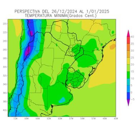• La mayor parte del Cono Sur observará temperaturas mínimas inferiores a 20°C, salvo algunos focos por encima de esa marca en su extremo norte.