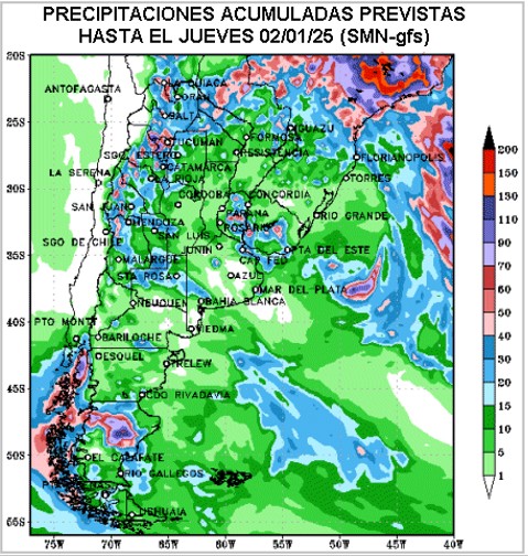 El posicionamiento de los sistemas de alta presión que ingresan tras los frentes y quedan pisando el continente ya lo hemos visto en muchas ocasiones y lo hemos descripto como un factor negativo en la producción pluvial estival. En este sentido, no podemos decir que es un comportamiento anómalo. Lo favorable es que es una dinámica que tiene alternancia y si bien la primera semana de enero se puede ver influenciada por esta característica, es razonable esperar una mejora en la oferta de agua para el inicio de la segunda semana de enero.