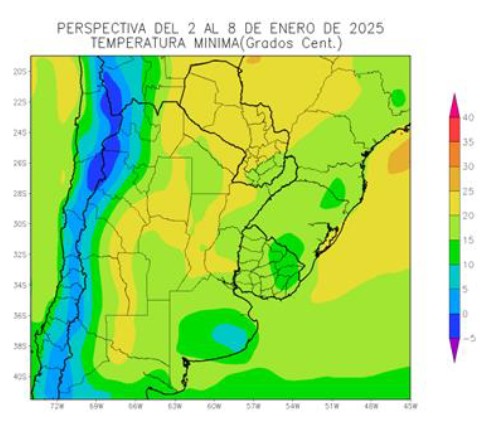 • El resto del área agrícola observará mínimas entre 15 y 20°C, con focos con registros menores, sobre las serranías bonaerenses y el este del Uruguay, con focos de registros menores, pero sin riesgo de heladas.