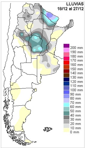 Las precipitaciones que se representan en el mapa, corresponden principalmente a lo en el último tramo de diciembre, con mejor oferta sobre CB, el centro de SF y zonas del centro oeste y sudoeste de ER. En esta ocasión los acumulados más generosos se recostaron sobre el centro de SF y la provincia de CB, sobre todo entre el viernes 20 y el lunes 23, en forma alternada, con tormentas y chaparrones dispersos de distribución heterogénea, que se emparejan al mapear un período más extendido. Estas lluvias han tenido una proyección dispar hacia otros sectores de la región pampeana, quedando zonas de LP, oeste y noreste bonaerense, el sur del NEA y el centro de la Mesopotamia, con totales modestos, en general incapaces de compensar las pérdidas por evapotranspiración y consumo de las coberturas.