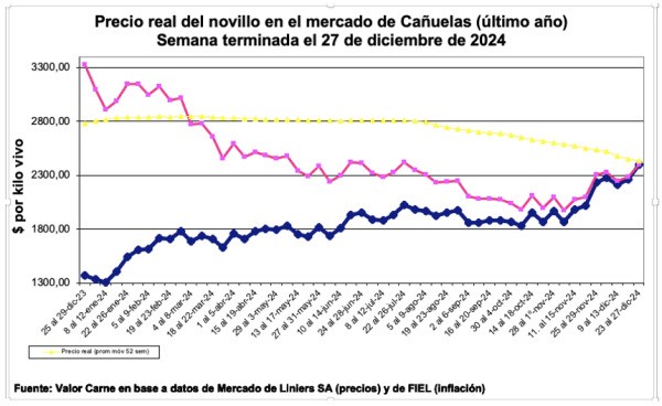Con este último incremento, el valor deflacionado del novillo de consumo se ubica en los niveles del trimestre junio-agosto, luego del cual hubo una caída importante hasta octubre que, desde mediados de noviembre comenzó a hacer el camino inverso.