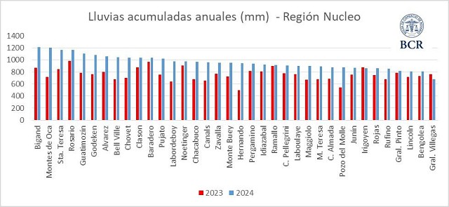 En el 2024 la región acumuló un promedio anual de 960 mm y las lluvias se acercaron al típico gradiente de 800 a 1200 milímetros de este a oeste. La mayoría de las estaciones metereológicas de la Red GEA registraron valores superiores al año previo, dejando en promedio 26% más de agua que en el 2023. Las mayores diferencias se evidencian en Hernando, con un 90% más de lluvias que en el 2023, Montes de Oca con un 70% más y Pozo del Molle con 60% más. Solo dos estaciones quedaron con valores por debajo del año anterior: Irigoyen y Gral. Villegas, con 2 y 11% menos de agua, respectivamente.