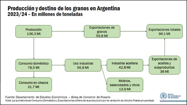 Las ventajas competitivas naturales y creadas de la producción agrícola y una densidad poblacional relativamente baja, se combinan para permitir un alto volumen de oferta exportable en Argentina. El cuadro a continuación muestra la distribución de la producción agrícola para la campaña 2023/24, que más allá de los números efectivos para dicho ciclo resulta aproximadamente similar todos los años. Puede observarse que sea como grano, o bien como aceites y subproductos, de una producción total de 136,6 millones de toneladas, 96,1 M, o el 70%, tiene como destino el mercado externo. Según la Secretaría de Agricultura, Ganadería y Pesca (SAGyP), Argentina se erige como el décimo productor mundial de alimentos y tercer exportador neto del mundo (SAGyP, 2024).