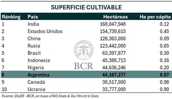 Argentina se caracteriza por la amplitud territorial y la aptitud del suelo agrícola, especialmente por lo que se conoce como “Pampa Húmeda”. En este contexto, no sólo es el octavo país más extenso del mundo y el cuarto de América (por detrás de Canadá, Estados Unidos y Brasil), sino que de acuerdo con la FAO cuenta con la octava superficie cultivable más grande del mundo, tal como se muestra en el cuadro adjunto. Al mismo tiempo, al comparar con otros países que componen el ranking, Argentina se encuentra menos densamente poblado. De esta manera, al comparar en términos de hectáreas cultivables per cápita, Argentina escala al segundo lugar entre el ranking de los 10 países presentados, con casi 1 millón de hectáreas por habitante, sólo por detrás de Canadá.