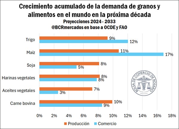 Con relación a la demanda de granos y subproductos como alimento forrajero específicamente, de 2024 a 2033 la FAO y la OCDE esperan que el stock ganadero mundial crezca 10%. De esta manera, el consumo y el comercio global de granos, harinas, aceites y otros alimentos aspira a crecer sostenidamente a lo largo y a lo ancho del mundo en la próxima década. (OECD-FAO, 2024)