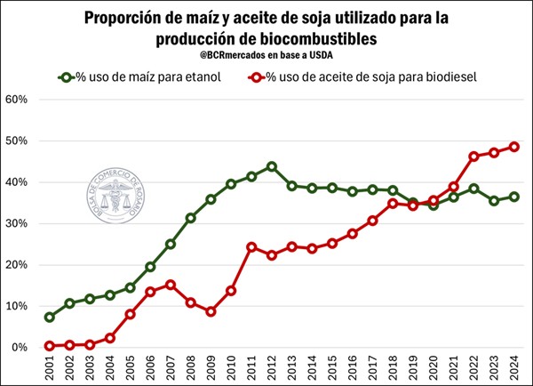 En esta reconversión de la matriz energética, la biomasa (incluyendo los cultivos agrícolas) está llamada a ser uno de los insumos claves para generar energía más limpia. En efecto, tal como muestra el gráfico adjunto, el porcentaje del maíz que se utiliza como insumo para la industria de bioetanol como proporción del consumo ha mostrado un crecimiento exponencial en la primera década del siglo XXI a nivel mundial, para estabilizarse algo por debajo del 40%. El uso de aceite de soja para la producción de biodiesel, en tanto, ha continuado su sendero alcista e impulsado más recientemente por el HVO se acerca a representar casi la mitad de la demanda total de este subproducto.