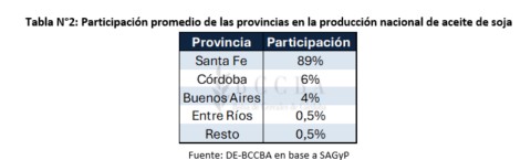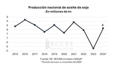 El aceite de soja es el más producido y comercializado del país, que se utiliza en la elaboración de alimentos, en la industria cosmética y en la producción de biocombustibles. Hasta el mes de noviembre del 2024, se produjeron aproximadamente 8 millones de toneladas de aceite de soja, 45% por encima al año anterior, debido a la recuperación en la producción de soja luego de la fuerte sequía que marcó al ciclo 2022/23. La producción se concentra principalmente en la provincia de Santa Fe con el 89% sobre el total, seguido por Córdoba con el 6%, Buenos Aires con el 4%, Entre Ríos 0,5%.