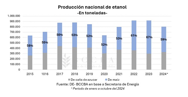 En cuanto a la producción a nivel nacional de etanol, en promedio, el 56% de la producción se realiza a base de maíz. A partir del 2020 tras el desarrollo del sector, la producción se ha ido incrementado, alcanzando niveles de producción de 804 mil toneladas hasta octubre del 2024 (último dato disponible), donde 476 mil son realizadas a base de maíz. Siguiendo a la Secretaría de Energía de la Nación existen 6 plantas habilitadas para la producción de etanol en el país.