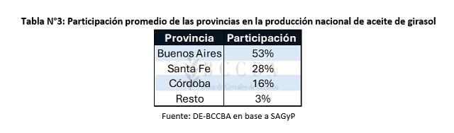 En segundo lugar, se encuentra el de girasol, destinado principalmente al consumo humano. En el periodo considerado de enero a noviembre del 2024, se llevan producidas aproximadamente 1,6 millones de toneladas, 7% por debajo del 2023, año que se ubicó como el volumen más alto de los últimos diez. En cuanto a la distribución de la producción por provincias, Buenos Aires concentra el 53% del total producido, Santa Fe el 28% y Córdoba el 16%.