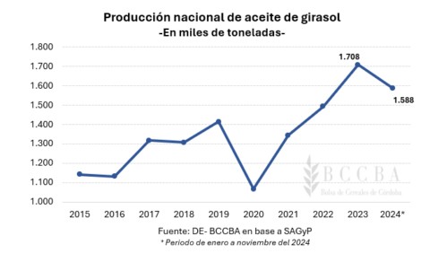 En cuanto a la producción de este aceite, se destina a la exportación aproximadamente el 50% del volumen total por año, ubicando a Argentina como tercera abastecedora mundial. En el periodo mencionado del 2024, ingresaron al país USD 770 millones en concepto de exportaciones de aceite de girasol, un 6% por debajo al mismo periodo correspondiente al año previo. Los principales destinos de exportación son India, Irak, México, Chile y Brasil.