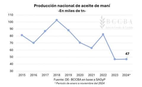 La producción del aceite de maní viene atravesando una disminución en su volumen durante los últimos seis años. Hasta el periodo mencionado del 2024 se han industrializado 47 mil toneladas, manteniéndose en los mismos niveles del 2023, considerados como las menores producciones de los últimos años. En cuanto a la distribución entre provincias, casi la totalidad de su industrialización se realiza en Córdoba.