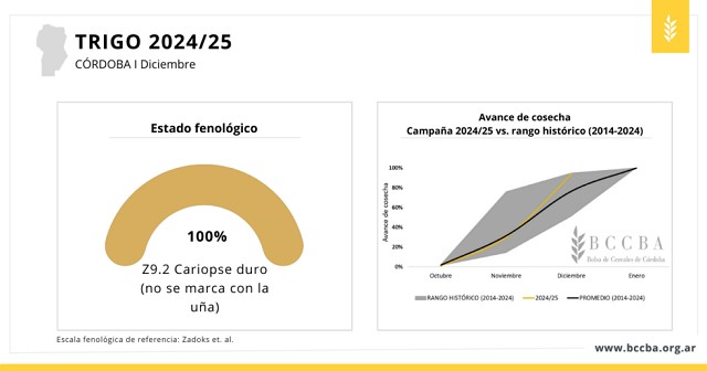 En cuanto al estado fenológico del cultivo, se encontraba a la fecha de relevamiento 100% en cariopse duro, lo cual es normal para la época y se condice con el avance de cosecha informado.