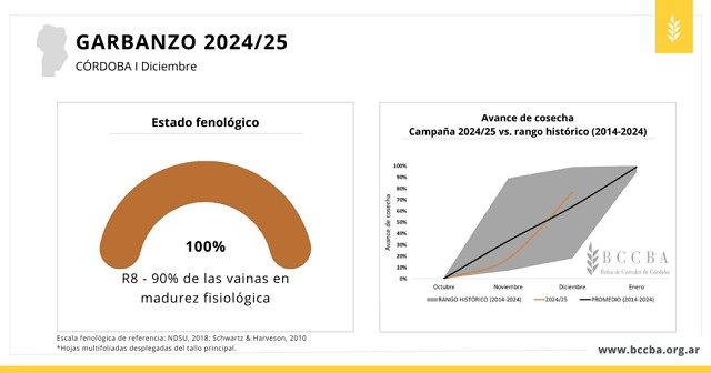 El avance de cosecha para garbanzo a mediados de diciembre era del 77%. Según referentes zonales, la mayoría de los lotes restantes estaban secados esperando a ser cosechados.