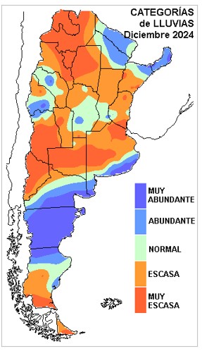 Las lluvias registradas en diciembre, comparadas con los valores estadísticos (1973-2024), contrastan en forma significativa respecto de lo que mostró el mes de noviembre. La segunda parte del mes no logro una performance satisfactoria y esto derivó en una fuerte anomalía negativa que resulta en una configuración prácticamente antagónica respecto del mes previo.