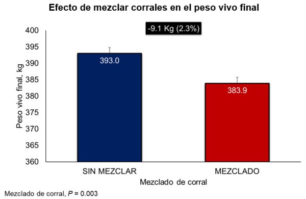 En cuanto a la mezcla de corrales, para hacer la evaluación, el día 49 del ensayo se realizó esta práctica en la mitad de los corrales bajo estudio (16 en total) y la otra mitad quedó como estaba.