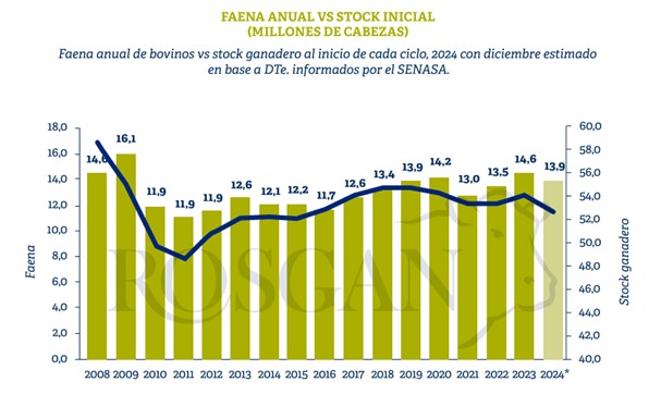 Según la misma estadística preliminar, de los 13,9 millones de animales que se estiman faenados este año, 2,63 millones fueron vacas y unos 4 millones fueron vaquillonas, cifra que no presenta disminución alguna respecto al pico de faena alcanzando en 2023 como consecuencia de la sequía.