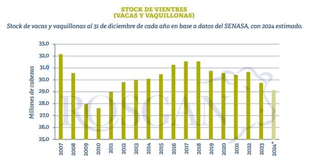 En números absolutos, al descontar la cantidad de vacas y vaquillonas faenadas durante el año, y asumiendo una reposición y mortandad de moderada a baja en ambas categorías, estimamos que las cifras finales del 2024 terminarán arrojando una nueva caída en número total de vientres útiles, que podría situarse entre los 500 mil y 800 mil vientres menos que los contados un año atrás.