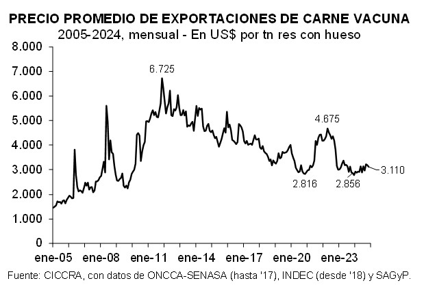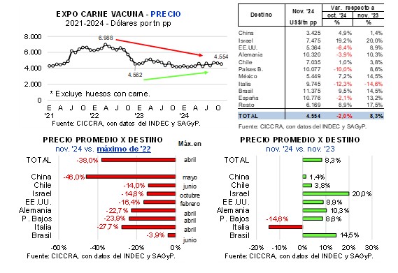 Las exportaciones de carne vacuna a China totalizaron 400.789 tn pp en los primeros once meses de 2024. En relación a igual período de 2023 fueron 5,9% mayores. Por su parte, el precio promedio pagado por los compradores chinos experimentó una baja de 11,3% anual (donde la mayor parte de la caída se produjo entre la primera y la segunda mitad de 2023), hasta ubicarse en 3.257 dólares por tn pp. Al combinar cantidades y precio, la facturación por estas exportaciones fue equivalente a 1.305,23 millones de dólares, registrando una caída de 6,1% anual.
