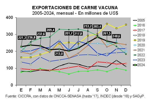 En lo que respecta a los ingresos por exportaciones de carne vacuna, en noviembre de 2024 fueron equivalentes a 248,6 millones de dólares. En comparación con los generados en octubre. En cambio, al comparar con noviembre del año anterior, la mejora fue de 15,9% (+34,15 millones de dólares), producto del mayor volumen exportado y de la recuperación de los precios de exportación en dólares estadounidenses.