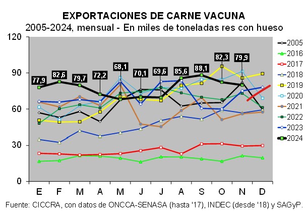 En los primeros once meses de 2024 el total exportado de carne vacuna ascendió a un máximo de 582,7 mil tn pp, superando en 13,8% al total exportado en el mismo período de 2023 y en 2,7% al máximo registrado en enero-noviembre de 2020. Del total, 82,8% se integró con cortes congelados y 16,5% con cortes enfriados, representando las carnes procesadas sólo 0,69% del total.