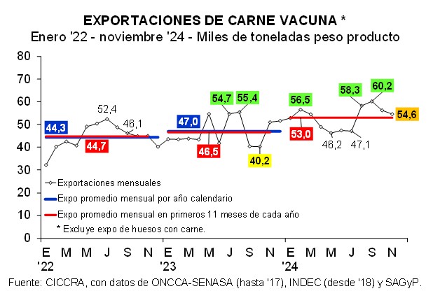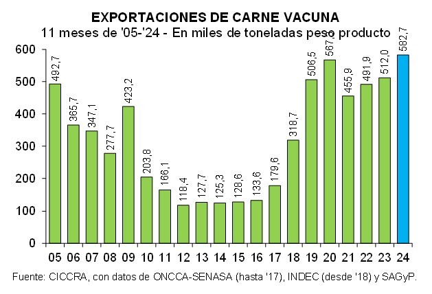 En los primeros once meses de 2024 el total exportado de carne vacuna ascendió a un máximo de 582,7 mil tn pp, superando en 13,8% al total exportado en el mismo período de 2023 (+70,67 mil tn pp) y en 2,7% al máximo registrado en enero-noviembre de 2020. Del total, 82,8% se integró con cortes congelados y 16,5% con cortes enfriados, representando las carnes procesadas sólo 0,69% del total.