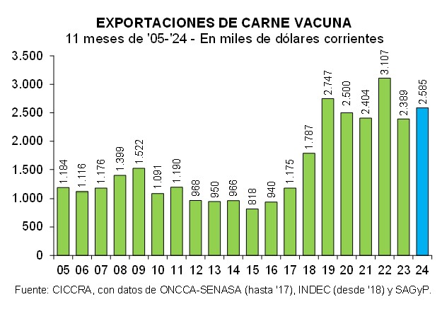 La facturación por las exportaciones de carne vacuna argentina totalizó 2.585,3 millones de dólares en once meses de 2024, valor que fue 8,2% mayor al correspondiente a enero-noviembre de 202.