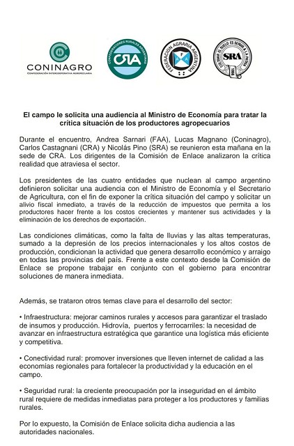 En el marco de una creciente crisis que afecta al sector agropecuario, los dirigentes de las principales entidades del campo argentino han solicitado una reunión urgente con el Ministro de Economía y el Secretario de Agricultura. La Mesa de Enlace, integrada por la Federación Agraria Argentina (FAA), Confederaciones Rurales Argentinas (CRA), Coninagro y la Sociedad Rural Argentina (SRA), se reunió esta mañana en la sede de CRA para analizar la crítica situación que enfrenta el sector.