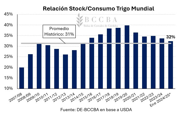 En su informe mensual, el USDA, estimó un leve aumento de la producción respecto al mes previo, situándola en 793,2 millones de toneladas. Además, pronosticó un menor consumo, debido a reducciones en Turquía, y un stock final que aumentó en casi un millón de toneladas respecto al mes de diciembre, implicando que la relación stock/consumo ronde el 32% y se establezca como la más baja de los últimos diez ciclos.