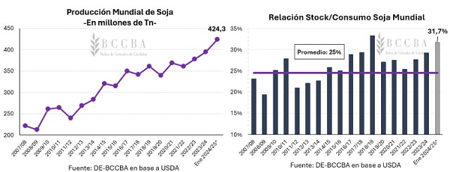 El Departamento de Agricultura de los Estados Unidos (USDA) en su informe correspondiente al mes de enero, ha realizado un leve recorte en la producción mundial, ubicándola en 424,3 millones de toneladas, que seguiría posicionándose como récord. La relación stock/consumo también sufrió un recorte del 3% respecto a diciembre, quedando por detrás del récord de la campaña 2018/19, en 31,7%.