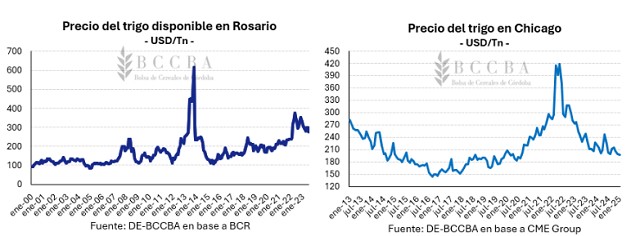 En el mercado disponible de Rosario, el precio promedio del trigo para el mes de enero se posiciona en USD 189 por tonelada, un 14% por debajo del precio del cereal en enero de 2024. En cuanto al mercado externo, en Chicago la tonelada cotiza a USD 198 para el mes corriente, lo que implicaría una caída del 10% interanual.