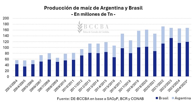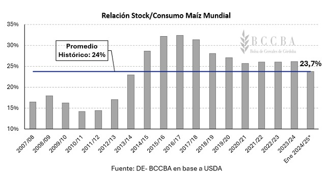 Según estimaciones del USDA, en el mes de enero la producción de maíz caería 3,5 millones de toneladas respecto al mes previo posicionándose en 1.214 millones de toneladas. Con este valor, pasaría a posicionarse como la tercera mejor producción de la historia por detrás de la campaña 2023/24 y 2021/22. Así mismo, con el consumo global casi sin cambios, alcanzando un récord de 1.238 millones de toneladas para la nueva campaña, lo cual provocaría una reducción de los stocks y ubica a la relación stocks/consumo en 23,7%, la menor de los últimos once años, incluso por dejado del promedio.