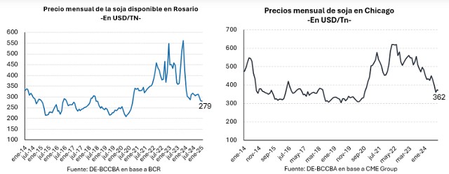 En cuanto a la cotización de la oleaginosa en el mercado local continúa su tendencia bajista, el precio promedio en lo que va de enero se posiciona en USD 279 Tn, el menor valor de los últimos nueve meses. Si se lo compara con lo observado en enero del 2024 (USD 331 Tn) la caída interanual asciende al 16%. Mientras que, en el mercado de Chicago se viene observando una tendencia bajista en los precios de los últimos meses, aunque, luego del nuevo recorte en la producción mundial, genero un soporte en los precios, ubicándose en USD 372 Tn (3% por encima al precio promedio del mes anterior).
